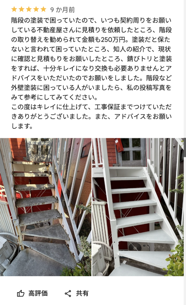 階段の塗装で困っていたので、いつも契約周りをお願いしている不動産屋さんに見積りを依頼したところ、階段の取り替えを勧められて金額も250万円。塗装だと保たないと言われて困っていたところ、知人の紹介で、現状に確認と見積もりをお願いしたところ、錆びトリと塗装をすれば、十分キレイになり交換も必要ありませんとアドバイスをいただいたのでお願いをしました。階段など外壁塗装に困っている人がいましたら、私の投稿写真をみて参考にしてみてください。 この度はキレイに仕上げて、工事保証までつけていただきありがとうございました。また、アドバイスをお願いします。