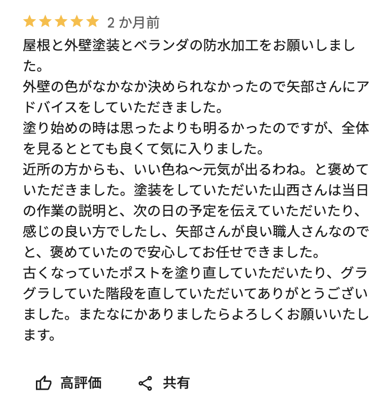 屋根と外壁塗装とベランダの防水加工をお願いしました。 外壁の色がなかなか決められなかったので矢部さんにアドバイスをしていただきました。 塗り始めの時は思ったよりも明るかったのですが、全体を見るととても良くて気に入りました。 近所の方からも、いい色ね〜元気が出るわね。と褒めていただきました。塗装をしていただいた山西さんは当日の作業の説明と、次の日の予定を伝えていただいたり、感じの良い方でしたし、矢部さんが良い職人さんなのでと、褒めていたので安心してお任せできました。 古くなっていたポストを塗り直していただいたり、グラグラしていた階段を直していただいてありがとうございました。またなにかありましたらよろしくお願いいたします。